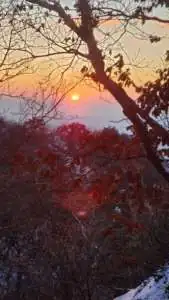 도선사에 7시에 도착하여 등산을 시작하였는데 이른 아침이라서 예상대로 등산객은 몇 사람 없었으며 1년 내내 동네 한 바퀴조차 돌지 않다가 신선한 공기를 공기를 들이 마시니 너무도 상쾌하다. 올라가는 도중 7시 47분쯤에 우연히 뒤돌아 보니 보기 드문 멋진 일출이 펼쳐진다.